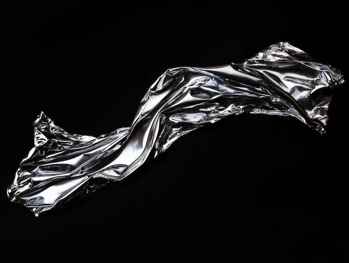 High-resolution render of crinkled aluminum foil with studio lighting.