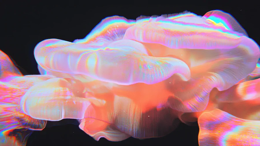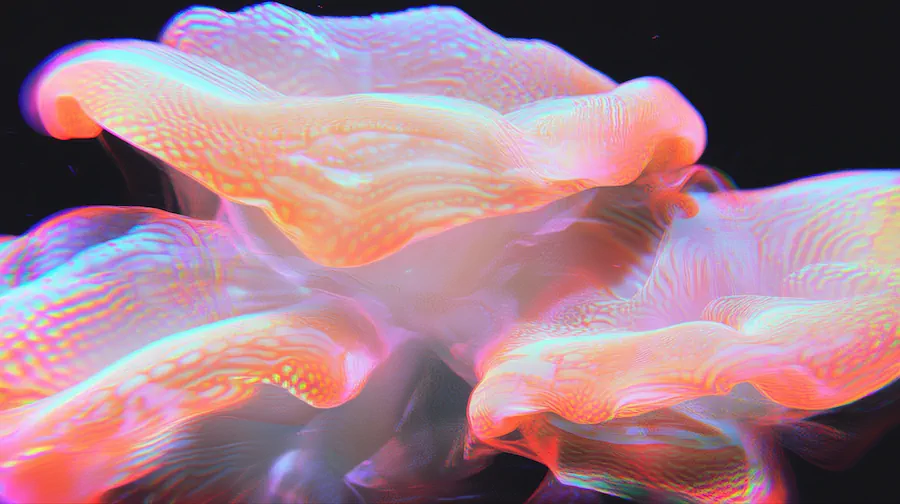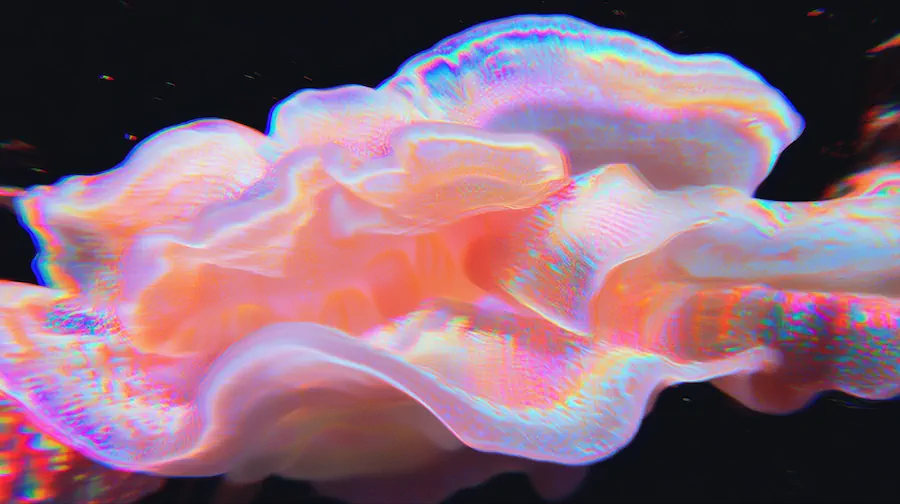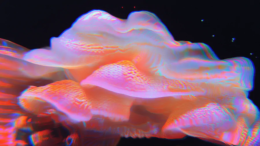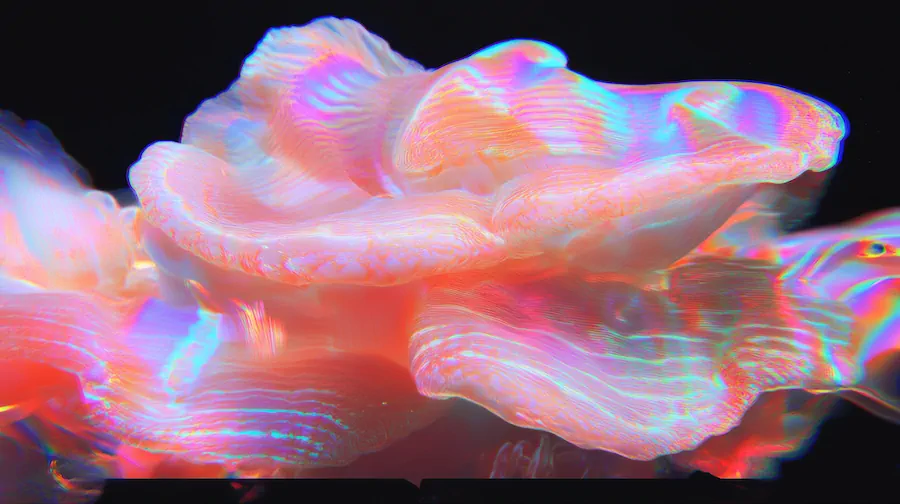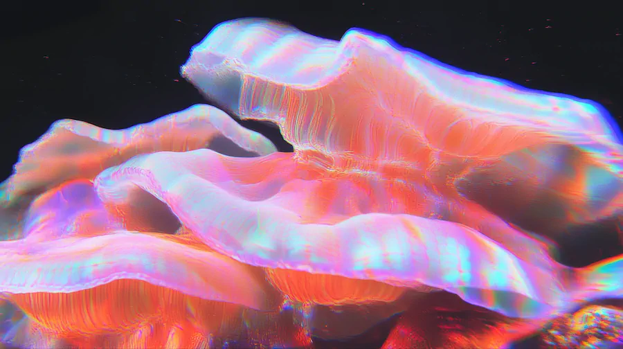Analog-glitch inspired corals glowing in a digital deep sea.